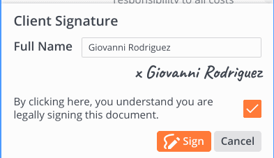 The pet owner types in their name and checks a box indicating they understand this signature is legally binding. Their signature is dated and time stamped. In addition, the Instinct user is logged as a witness to the signature. All this information is securely stored and trackable.